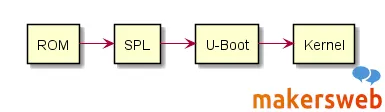 부팅 1단계로 boot rom ROM 코드가 실행된다. 이후 sram으로 작은 부트코드를 로드한다. 예를 들면 NAND 플래시 메모리, SPI (Serial Peripheral Interface)를 통해 연결된 플래시 메모리, MMC 장치의 첫 번째 섹터 (SD 카드) 등에서 SPL을 읽는다