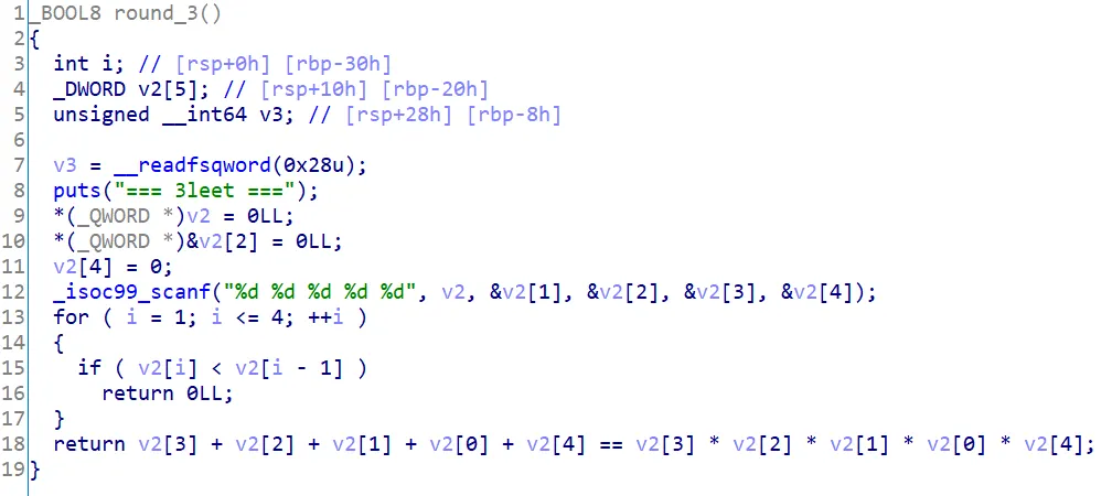 3) round_3() 함수는 v2 기준으로 각 인덱스의 값이 점점 같거나 커져야 하고, 총4개의 값을 더한 값과 곱한 값이 같으면 된다.