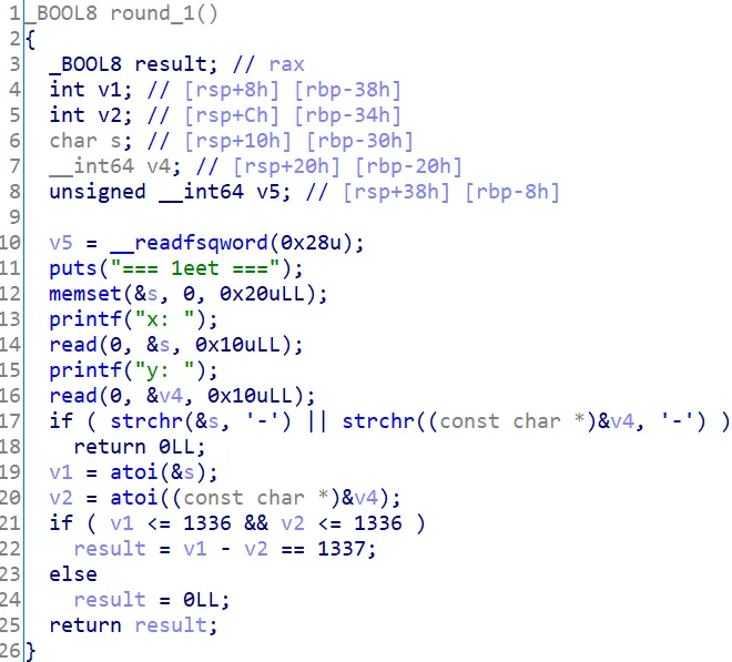 1) round_1() 함수는 결국, 1336 - (-1) 를 입력하면 된다. -1를 직접 입력하면 안되고, 인티져 오버플로우를 일으켜서 알맞게 변형시키면 된다