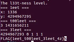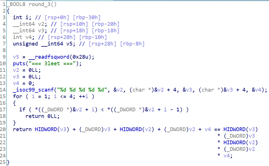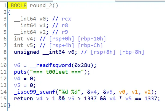 2) round_2() 함수 역시 인티져 오버플로우를 일으켜서 해당 조건에 맞게 세팅해주면 된다. v4는 1보다 크게, v5는 1337보다 크게 입력하고 두 값을 곱한 것이 오버플로우로 1337이 되게 하면 된다