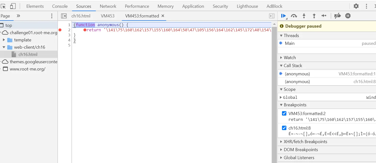 요렇게 step-in을 하다보면 function anoymous()라고 보이는 함수로 들어온것을 볼 수 있다. 여기서 return 되는 값을 알아보기 힘들 값들로 되어있는데, 여기서 2번 라인에 bp를 한번더 걸고 계속해서 step-in을 해보자.