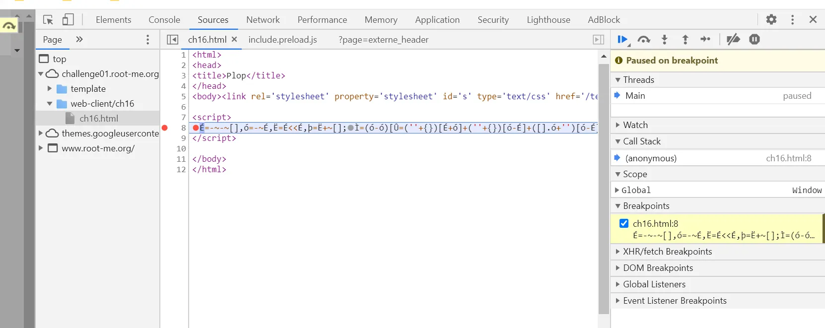 난독화가 되어있다. unescape(), decodeURI() 요런거를 사용해도 난독화된 코드를 읽을수 없었다. 크롬의 개발자도구를 이용해서 해당 스크립트를 디버깅해보았다.