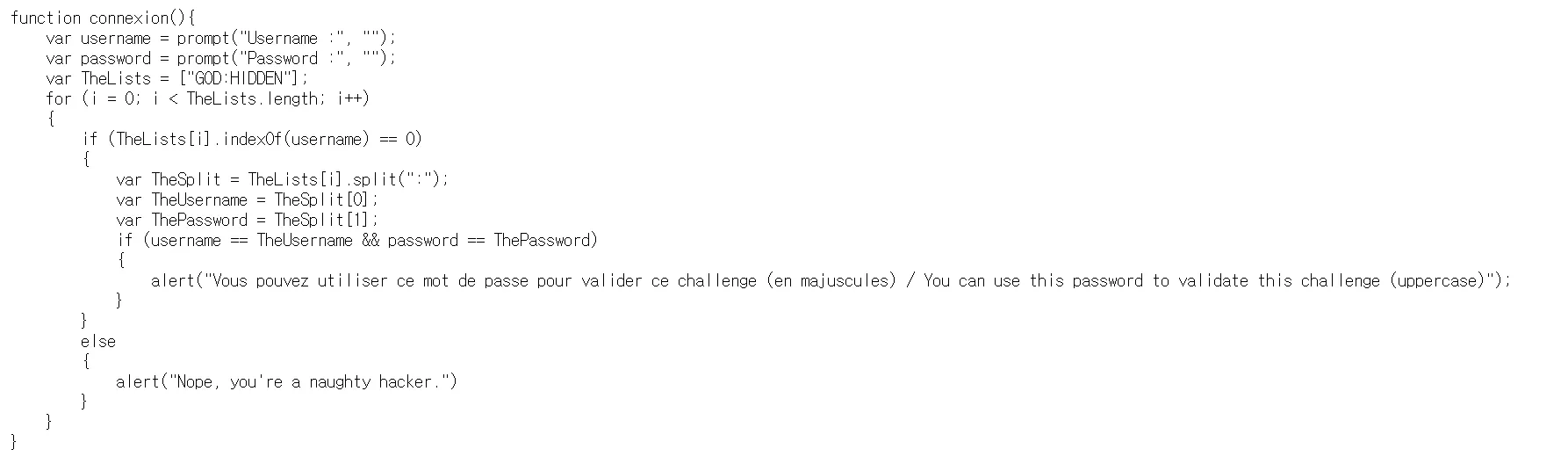 입력한 이름과 비번을 각각 변수에 담는다. 그리고 TheLists[0]에 담겨져 있는 값에서 사용자가 입력한 단어가 존재하는지 확인한다. 해당 단어가 인덱스0 위치에 존재한다면, " : " 를 기준으로 split한뒤에 GOD와 HIDDEN을 아디, 비번으로 입력한 값들과 매칭을 한다.