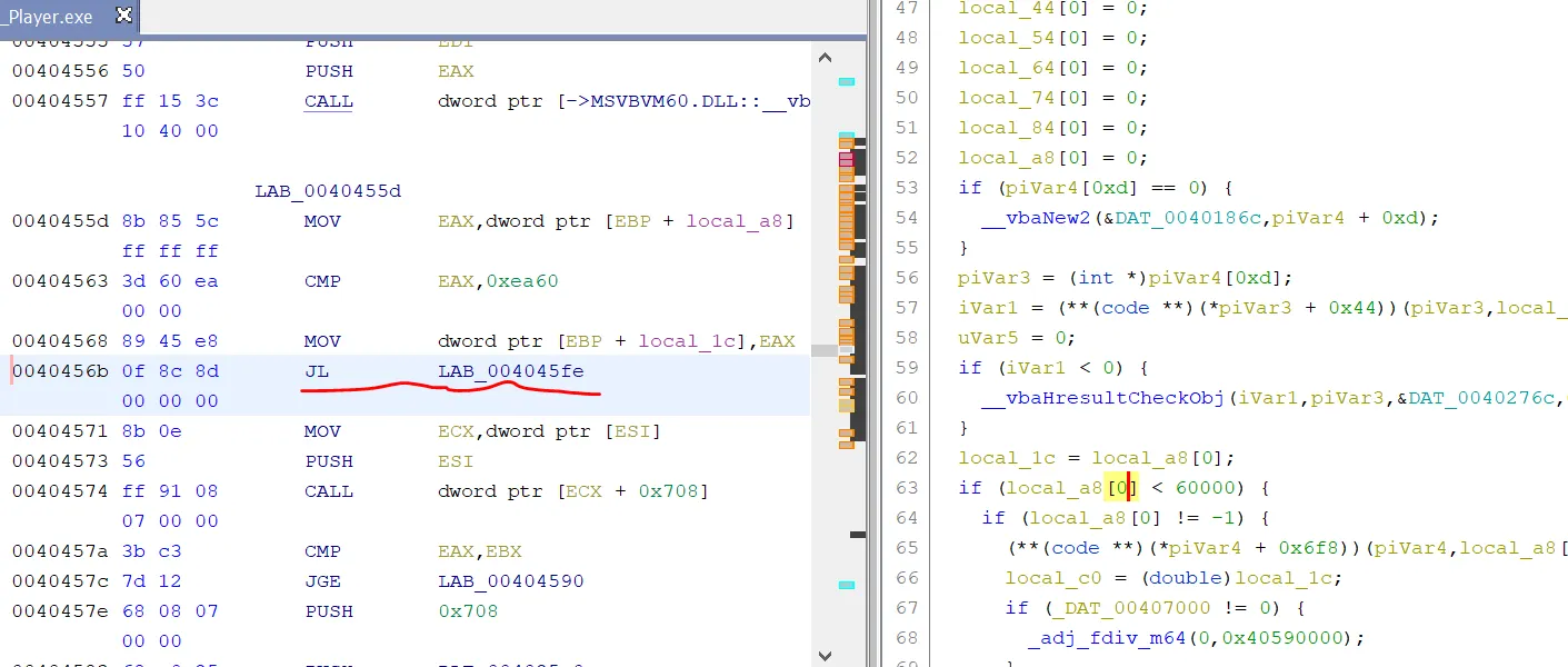 저기 JL 부분을 무조건 if문 안으로 들어오게 하기 위해 JMP로 코드패치를 하면 된다.