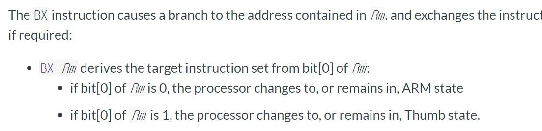 bx or blx를 이용해서 jmp할 때 오퍼랜드로 레지스터가 들어감. 그 레지스터에는 jmp할 주소가 들어감. 그 주소는 4바이트로 정렬되어있음. 따라서 하위 한 비트는 안쓰임. 이 bit를 이용해서 mode 체크를 진행함.