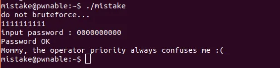 연산자 우선순위가 힌트다. 여기서 연산자 우선순위가 먹힐만한 곳은 정해져있다. 처음에 password 파일을 열고, 정상적이라면 fd=3에 할당받을것이다. 만약 그 값이 음수면 종료되는 예외처리가 있다. 헌데 연산자 우선순위에서 < 가 = 보다 더 높은 순위이므로 open() 결과인 3 < 0 이 먼저 연산된다.