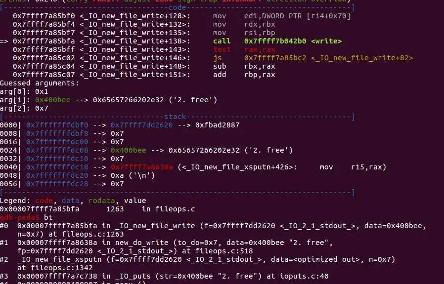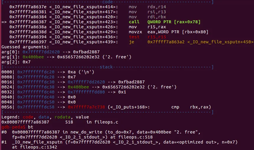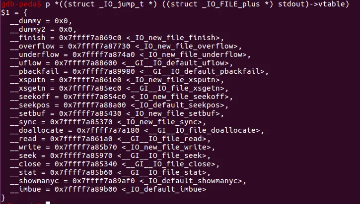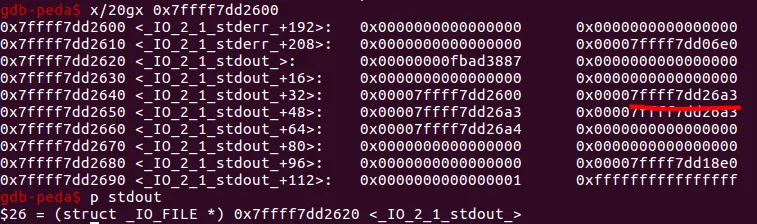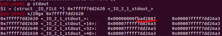 gdb-peda$ set {int}0x7ffff7dd2620=4222425088 // 0xfbad3887