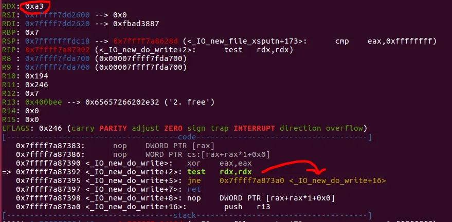 set으로 위 주소의 들어있는 값들을 변경하면 _IO_do_write 가 실행될때 rdx가 0xa3으로 변경되어있는것을 확인가능하다. 따라서 정상적인 루틴에서는 rdx가 0 이여서 ret로 갔지만 지금은 +16주소로 jump할 것이다.