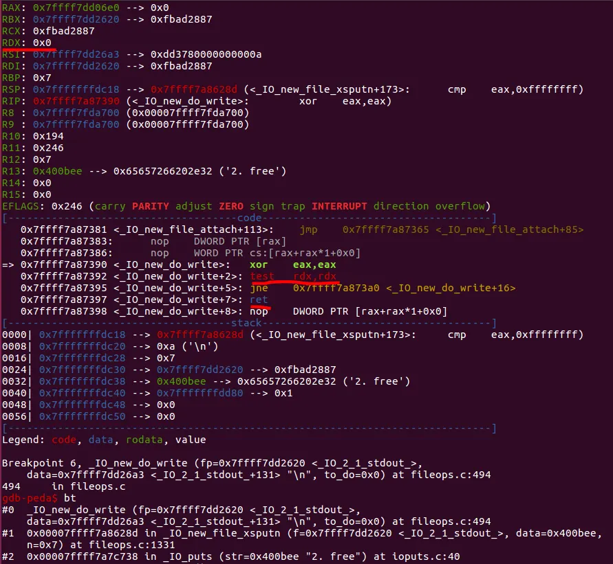 IO_do_write 함수에 bp를 걸고 실행을 하면 IO_new_do_write함수에 걸린다. 아마 둘이 같은함수인거같다. 해당 함수가 호출되면 rdx가 0이면 ret로 가고 0이 아니면 +16라인으로 jump를 한다. 현재 rdx는 0이므로 ret로 가게 된다