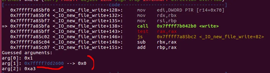 아까처럼 결국 write함수가 호출될텐데, 가지고가는 인자를 확인하면 첫번째 인자는 동일하게 fd=1이지만 두번째 인자는 문자열이 저장된 주소가 아닌, 0x7ffff7dd2600 의 주소가 들어가 있다. 또한 사이즈 부분도 0xa3이 들어가 있다.