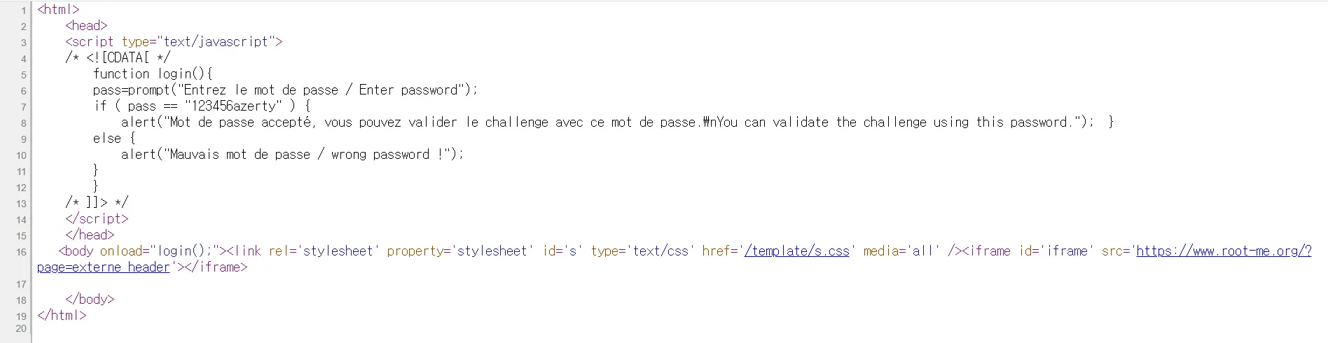 body태그에 onload 이벤트로 login() 함수가 등록되어 있다. login() 함수를 살펴보면, prompt로 비밀번호를 입력하게끔 한다. 그리고 입력한 비밀번호가 123456azerty 인지 아닌지 체크한다. 그냥 요게 답인거 같다.