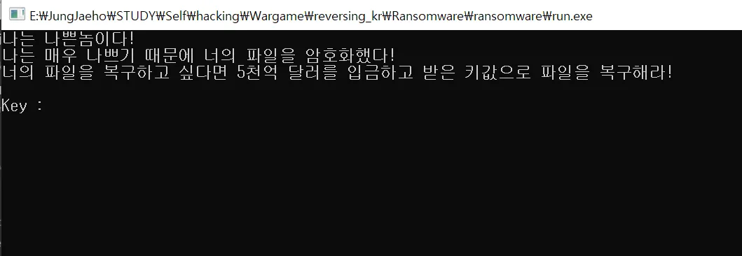 file이라는 암호화된 파일이 있다. 저거를 풀라면 올바른 키값을 입력하라고 한다. 힌트로 file은 exe 실행파일이라고 한다.