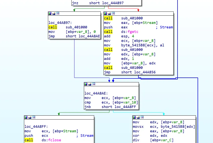 위 그래프를 보면 fgetc로 한바이트 읽어온 값을 0x5415b8 위치에 한바이트 저장하고 우측 하단에서 이를 이용한다. 저게 아마 파일에서 읽어온 값이 저장되는거 같다