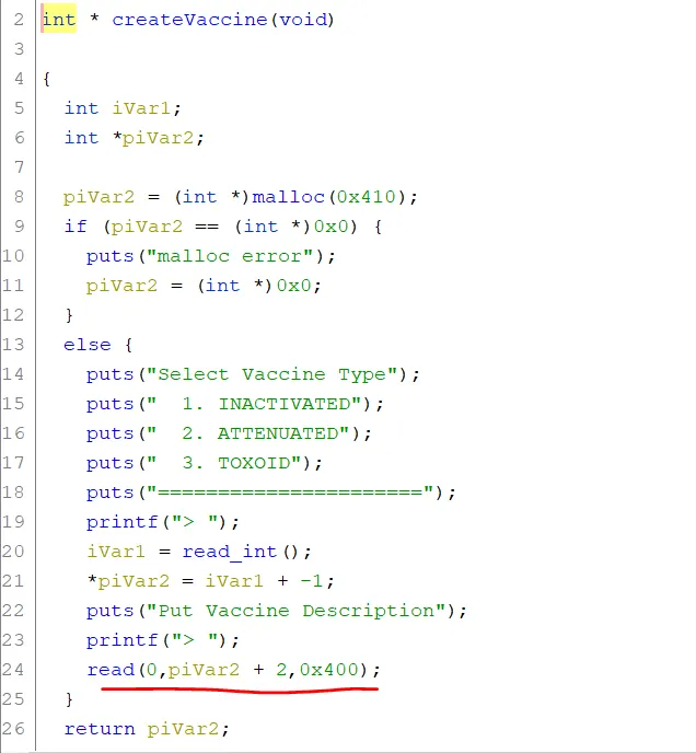1번 메뉴를 선택하면 백신 타입과, 설명을 작성할수 있었다. add_vaccine 함수 내부에서 create_vaccine 함수를 호출하는데, 여기에서 입력을 받게 된다. 0x410만큼 힙영역을 할당받고, 백신 타입을 선택한다.
