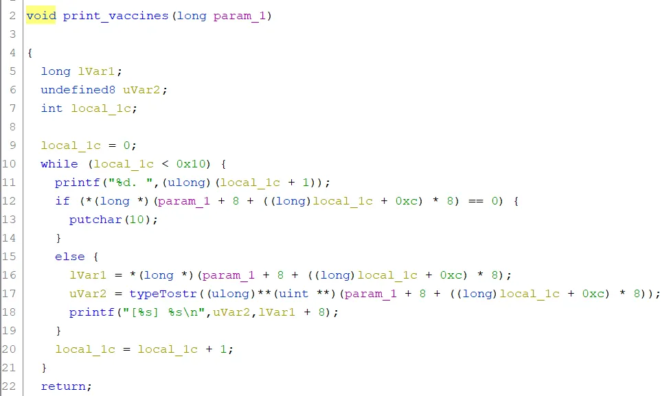 아까 힙 주소에는 첫 8바이트에는 타입을 나타내는 값이 들어있고, 그다음 8바이트부터 0x400사이즈 이내에 백신 설명값이 들어있다. uVar2에는 백신 타입이 들어가고, lVar1+8에는 백신 설명이 들어가는데, 출력의 끝을 의미하는 널바이트가 없기 때문에 만약 0x400를 꽉채워서 백신 설명을 채우면,