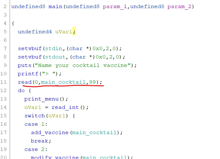 createVaccine()함수에서 할당받은 힙 주소를 반환한다. 현재 param_1에는 bss영역에 담긴 main_cockatil 주소가 담겨져 있다. 추가할수 있는 공간이 존재하는지 체크를 하고 존재한다면, 할당받은 주소 + 0x408에 main_cockail 주소를 넣는다.
