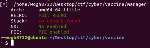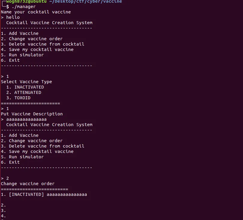 manager 바이너리를 실행시키면 cocktail vaccine을 입력받는다. 그 후에 6개의 메뉴가 출력된다.