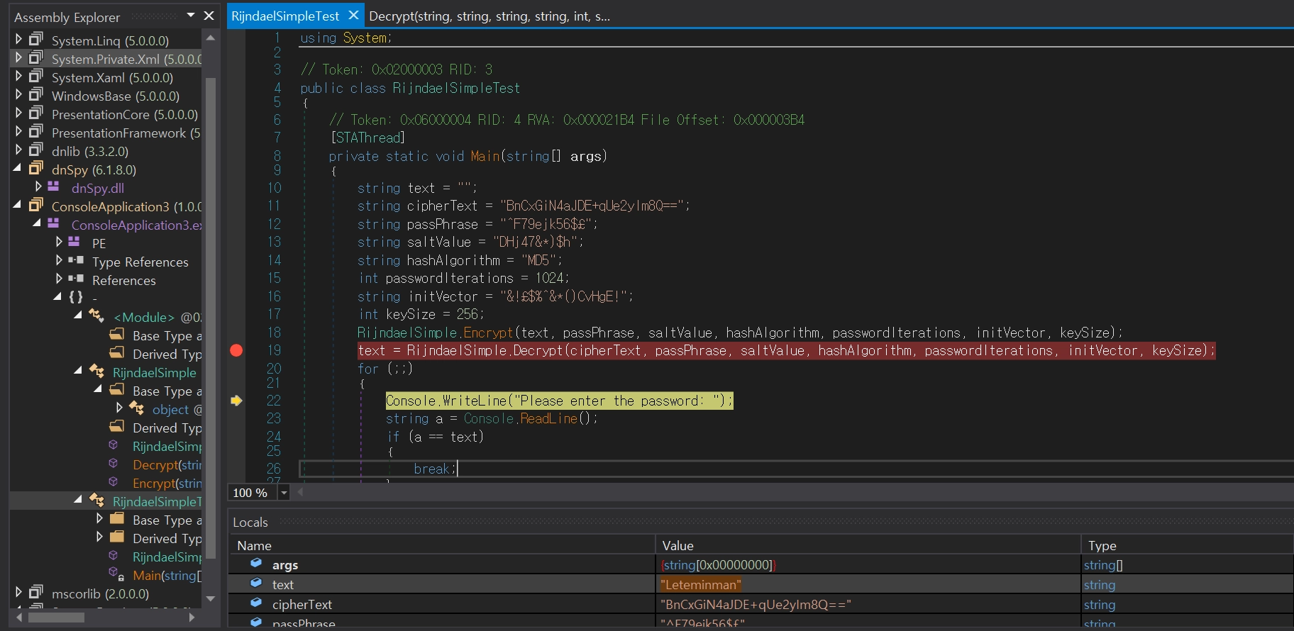 디버깅도 할수 있어 개꿀이다. main을 보면 Encrypt, Decrypt 함수 호출결과 값과 입력값을 비교한다. 끝이다. 내부 암복호화 로직을 구현해도 되지만 걍 결과값만 보면 바로 문제를 풀 수 있다