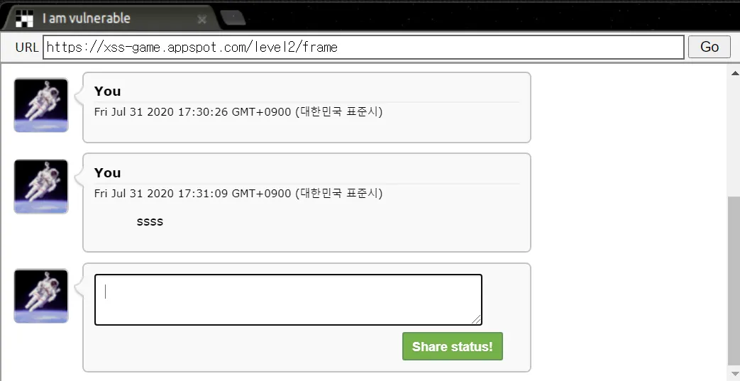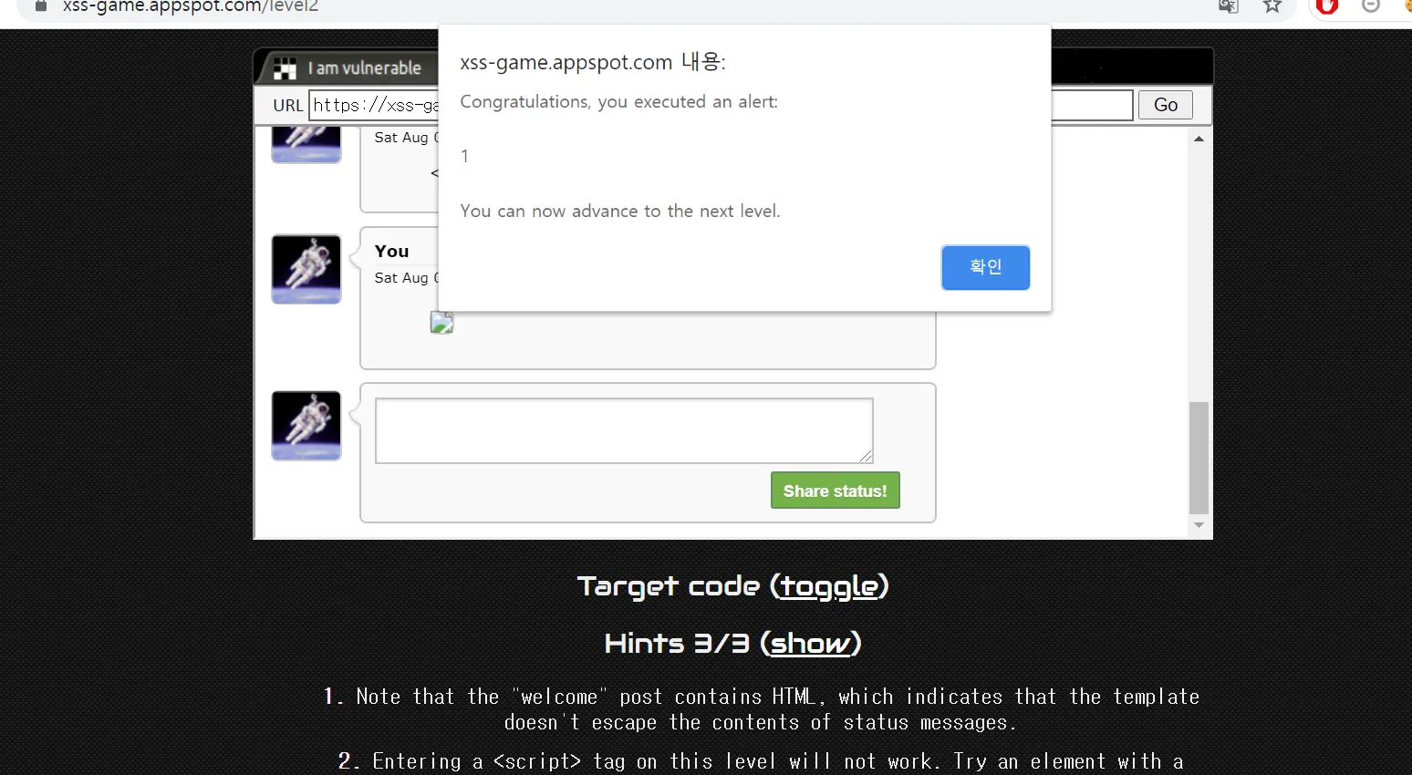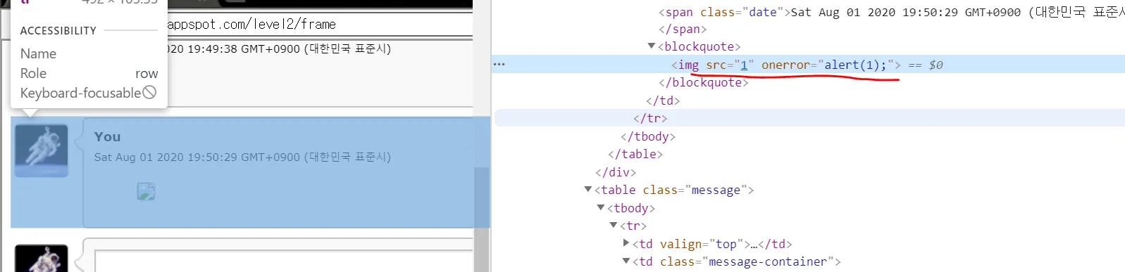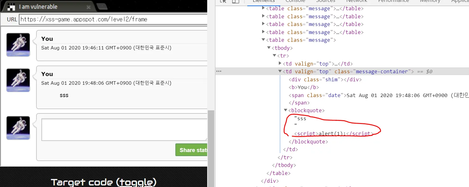 입력한 img 태그가 그대로 삽입되고, onerror가 실행되면서 alert창이 뜬다. 이번 문제는 <script>태그의 동작을 막는 필터링이 되어있을 것으로 유추된다.