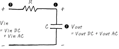 캐패시터란 전기를 일시적으로 저장하는 소자이다. 캐패시터는 교류 신호만 통과할 수 있으며 충전과 방전을 반복하여 과도 파형을 만들어내는 기능을 한다.(발진) 또한 보조 배터리처럼 전압을 충전한 다음 전류를 출력하는 기능도 한다. 그리고 노이즈 성분을 그라운드로 흘려버리는 기능을 한다.(바이패스)