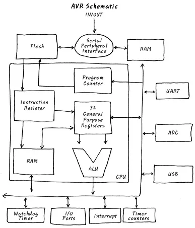 위 그림은 앞서 설명한 CPU에 Embedded System에 걸맞게 여러가지 외부 기능이 더해진 AVR MCU의 구조이다.