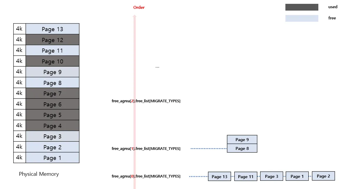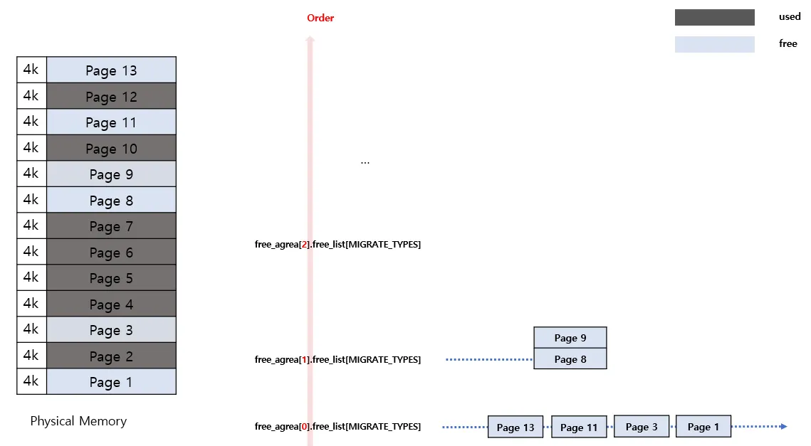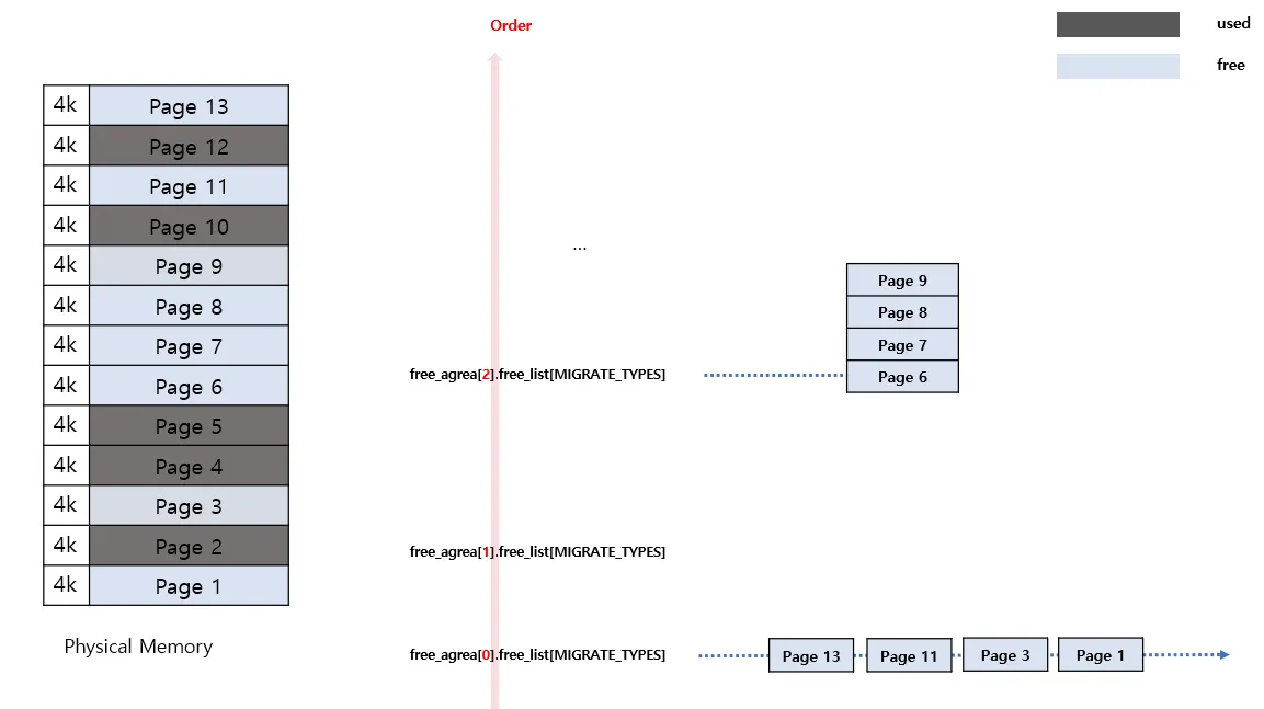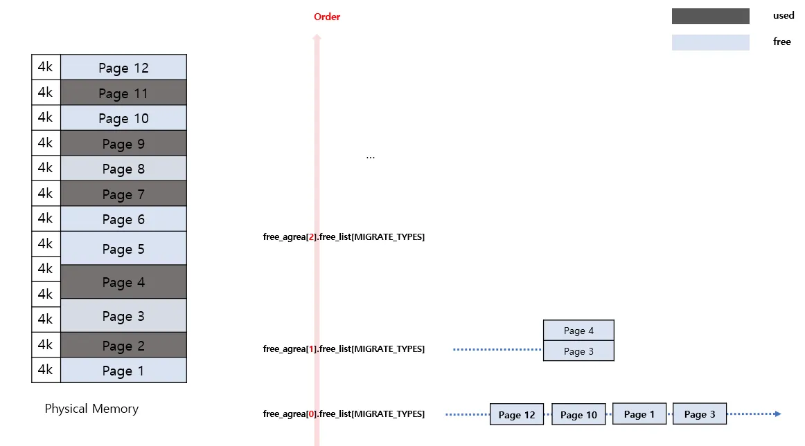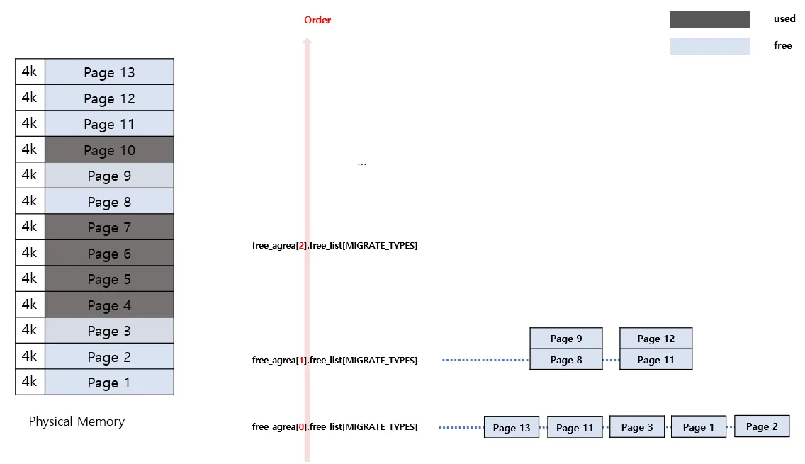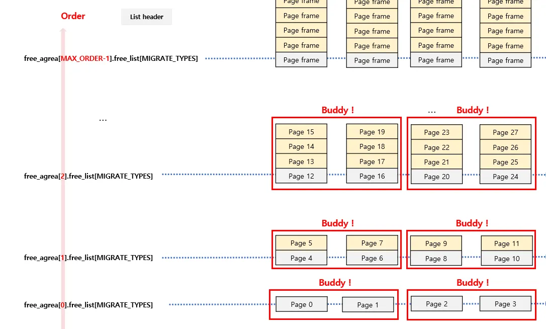 아래 그림은 각 free_area order 별 free_list에 연결되어 있는 페이지들을 나타낸 그림이다