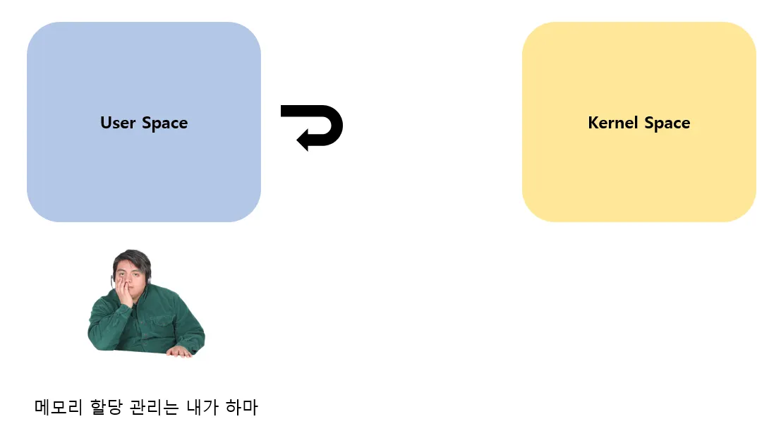 매번 이렇게 유저가 요청할때마다 커널에 요청하고 커널이 일하고 ... 비효율적이다. 따라서 유저단에서 매니저를 하나 고용하여 메모리를 처리할 수 있게 일을 주었다