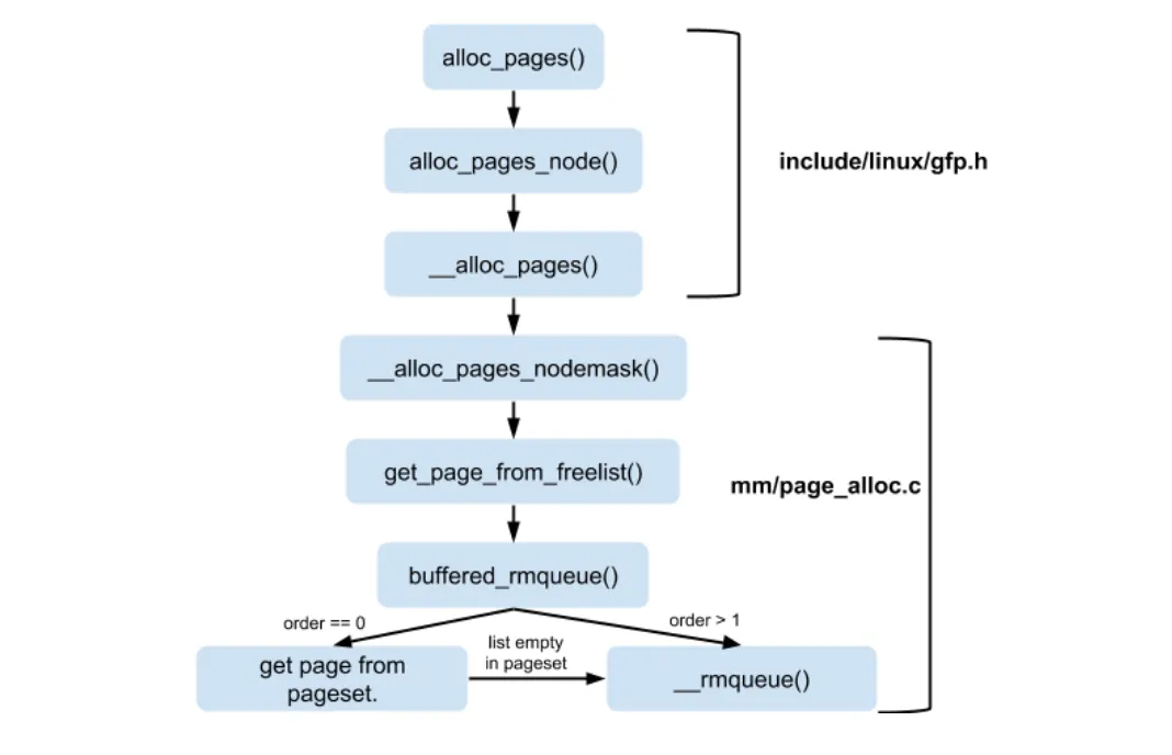 우선 버디 시스템에서는 order 단위로 페이지 할당을 요청한다. 이것은 2^n 단위로만 요청을 할 수 있음을 의미한다. 예를 들어, order 3에 해당하는 페이지를 요청하는 경우 8(2^3 )개의 연속된 페이지들를 요청하는 것이다.