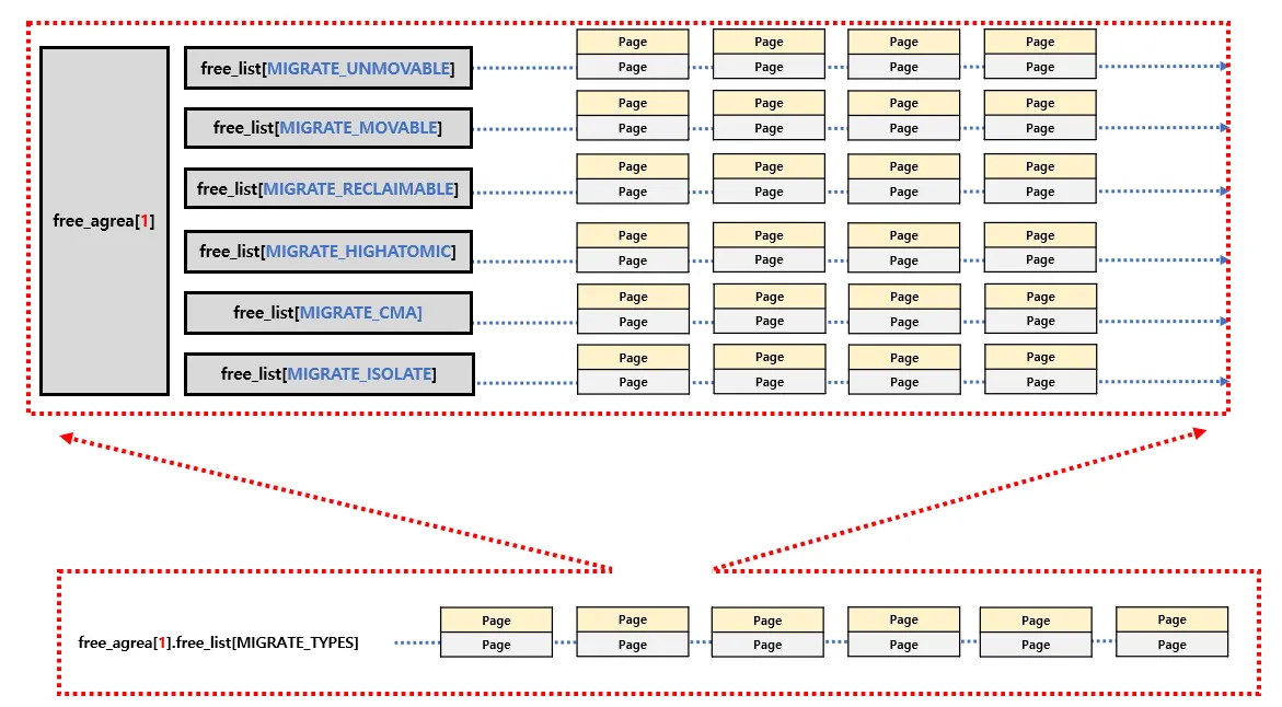 이전 메모리 존 설명에서 struct zone 구조체 중 free_area 구조체를 확인했었다.