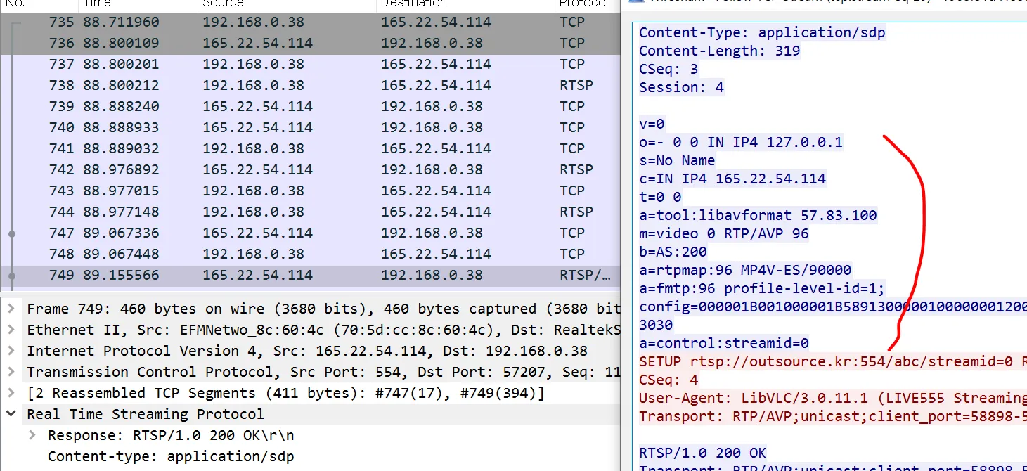 rtsp 패킷을 잘 찾아보면 세션과 관련된 내용이 들어있는 패킷을 찾을 수 있다. 저 내용을 sdp에 써야한다.