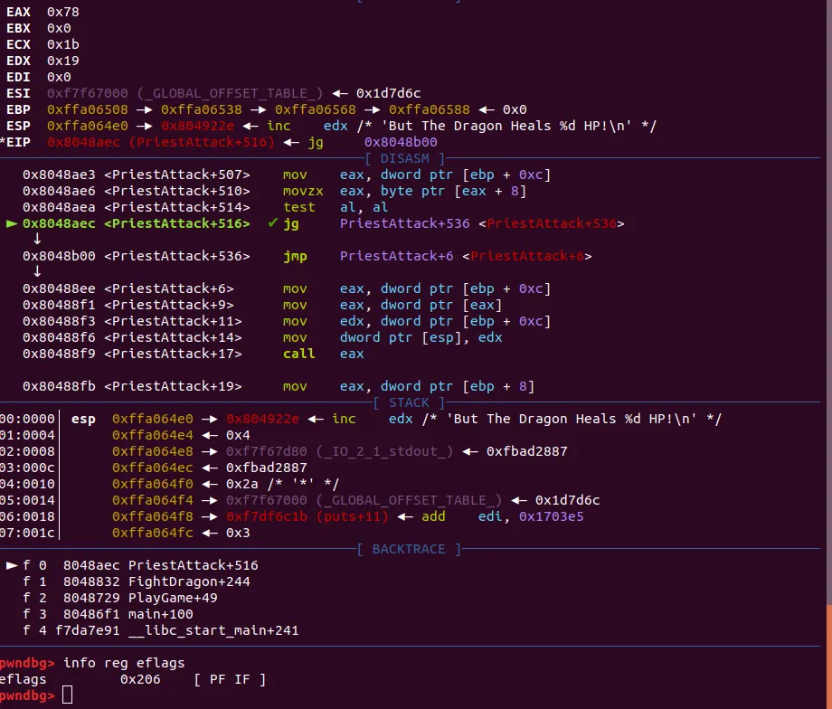 PriestAttack() 에서 3가지의 스킬을 가진다. 헌데 이 3가지 스킬중 아무거나 해도 엄마 용의 hp는 매번 +4씩 회복된다. hp는 부호있는 한바이트의 자료형을 갖는다. 따라서 엄마용의 hp는 overflow 시켜 음수의 값으로 만드는게 포인트이다./