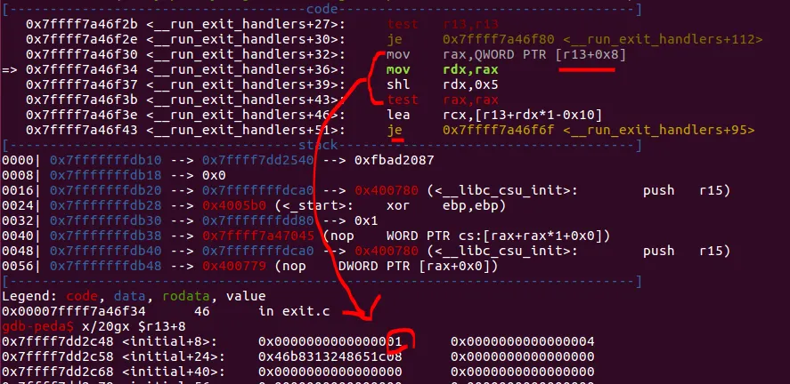 exit 코드를 분석할 필요가 있는데 결로적으로 exit 내부에서 특정 조건에 해당됬을 때 호출되는 free를 이용하여 free_hook을 one_gadget으로 덮는 것이 목적이다.