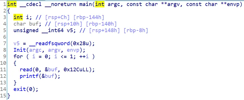 for문으로 총 2번 반복을 하게 된다. read로 0x12c 만큼 입력을 받은뒤, printf로 출력을 한다. 여기서 서식문자가 없으므로 fsb가 터질 것이다.