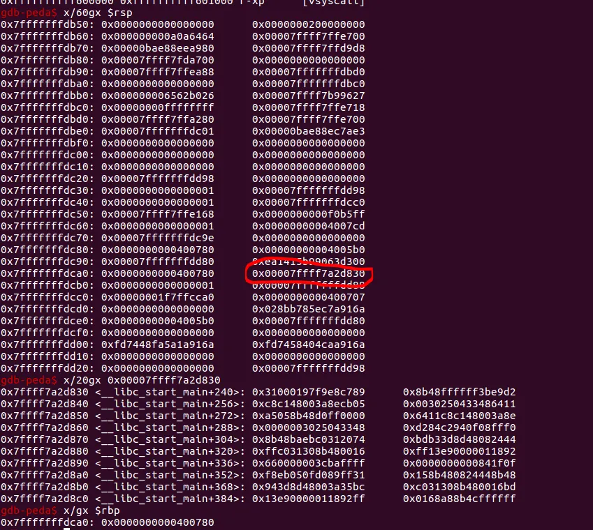 보통 메인함수가 다 수행되고 ret를 하는 위치가 libc_start_main+240이다. 따라서 ret를 leak하여 libc_base를 구하자