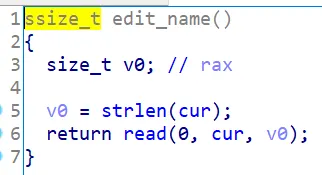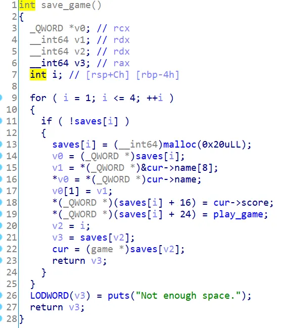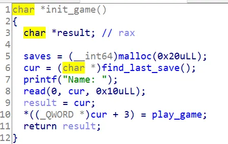saves는 전역변수로 설정되어있는 배열이다. find_last_save() 함수의 반환값으로 cur에는 동적할당한 주소값이 들어있다. 해당 위치에 0x10 크기만큼 이름을 입력받고, +3 위치에 play_game 함수의 주소값을 넣는다. 아마 이부분은 직접 확인해 봐야 정확할것 같다.