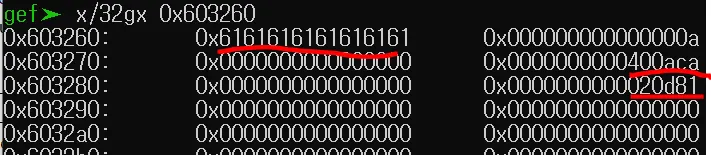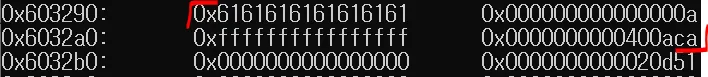 init_game 함수가 종료되고 현재 힙영역에 다음과 같이 들어가있다. a를 8개 입력하고 엔터를 쳤으니 0x61 8개, 0xa 1개 가 들어가 있다. 해당 데이터는 cur에 위치해 있고, 아까 play_game 함수의 위치는 cur+0x18 위치에 있다. 아까 +3이 8바이트 단위로 저장하는 것으로 보인다