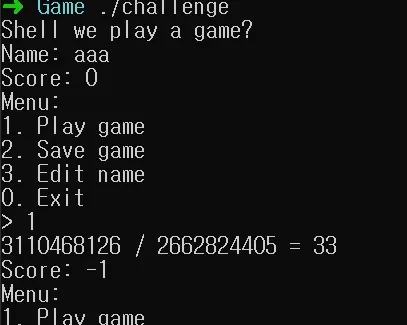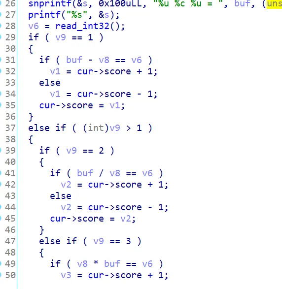 코드가 복잡해 보이지만, 자세히 분석해보면 이해하기 그리 어렵지 않다. 문제를 계속 실행시켜보면, 덧셈, 뺄셈, 나눗셈, 곱셈을 랜덤하게 묻는다. 위의 snprintf 부분이 랜덤적으로 출력해주는 부분이고, v9에 따라서 연산의 종류에 따른 조건분기가 일어난다. 대충 흐름을 파악했으니, play_game() 함수의 실행 결과를 보자.