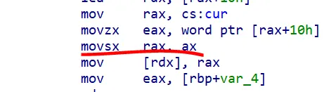 밑줄친 부분은 위 사진의 18라인의 어셈부분인데, movsx로 복사가 이뤄진다. movsx는 ax의 첫비트를 부호비트로 판단하여 rax의 나머지 6바이트를 부호비트의 값으로 채우는데, 현재0xffff가 들어있으므로, rax는 결국 0xffffffffffffffff 이 들어가게된다.