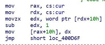 rdx에는 cur의 주소가 들어가 있다. mov가 아닌 movzx 명령어를 사용했음으로 크기가 다른 데이터의 복사가 가능하다. rdx+0x10 위치에 들어있는 2바이트 값을 edx에 4바이트 만큼 복사하고, 남는 상위 2바이트는 0으로 채운다.