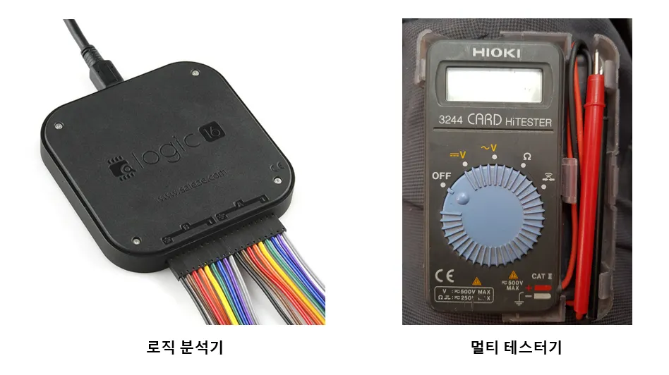 보드에서 VCC, RX, TX, GND 핀을 각각 식별해야한다. 식별하는 방법은 보편적으로 멀티테스터기를 이용하거나 로직 분석기를 이용한다.
