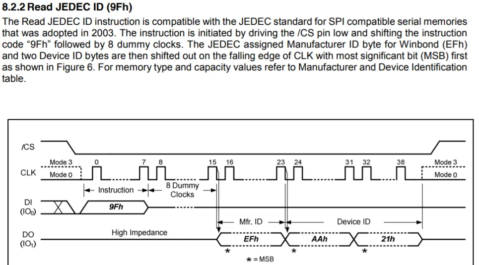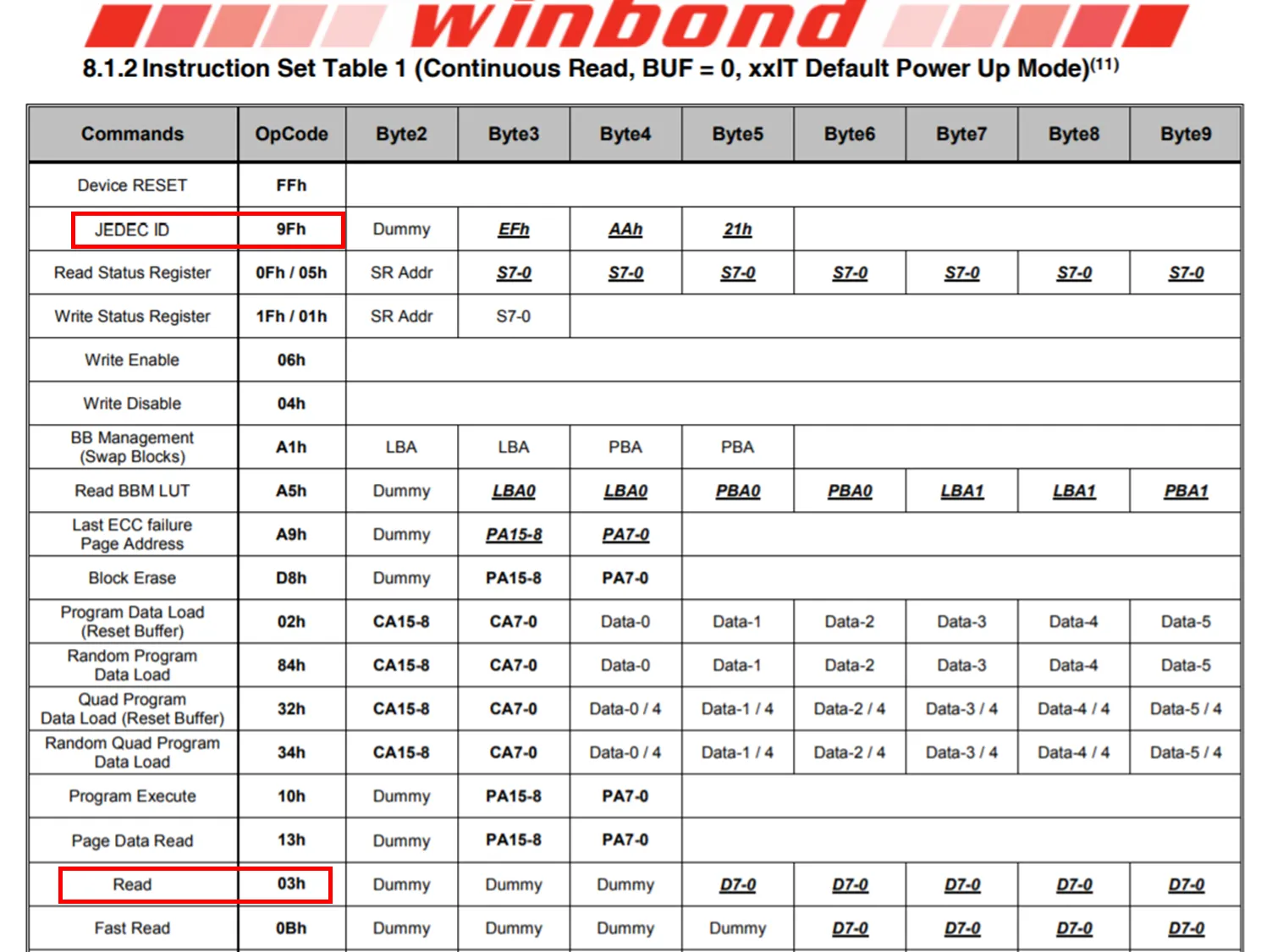 데이터 시트를 잘 보면 특정 명령에 따른 opcode를 확인 할 수 있다. Read Data 의 경우 Opcode는 3이며 제조사 ID를 읽는 Opcode는 0x9F이다.