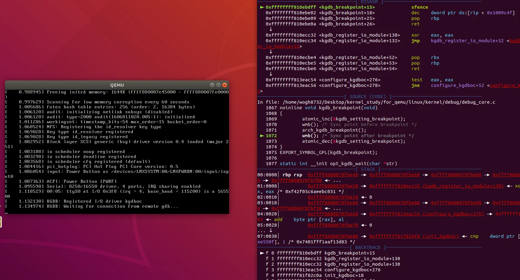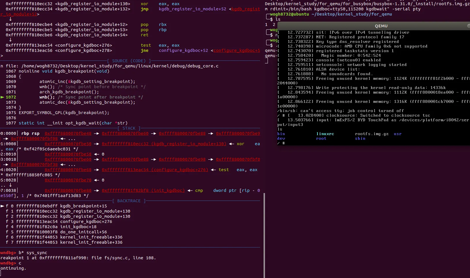 라는 로그를 볼수 있다. 즉, 커널 부팅후 아까 설정한 쉘을 띄우기 전에 gdb가 붙기를 기다린다. 이제 Host에서 붙어보자. host에서는 boot.sh의 serial pty 설정으로 인해 시리얼로 붙을수 있게 된다. 정확한 시리얼은 host에서 로그를 보면
