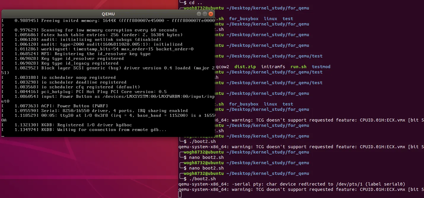 왼쪽이 qemu인데, 로그 메시지를 잘보면