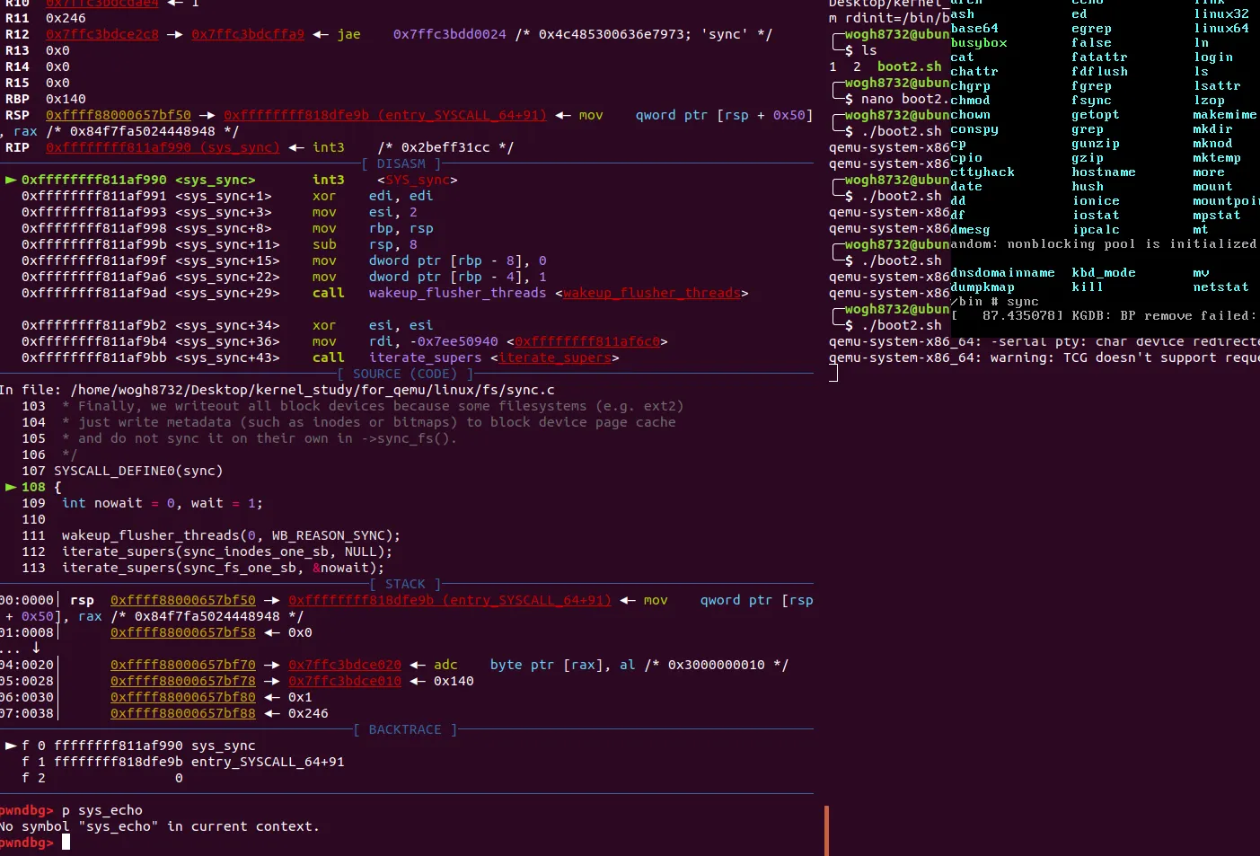 c를 하면 qemu가 다시 가동되면서 쉘이 실행된다. 이제 터미널에서 time을 입력하면, syscall인 sys_sync 함수에서 bp가 걸릴것이다. 즉 system call 디버깅 가능. 보통 user 단에서 어셈으로 보면 syscall 했을때 trap 걸리면서 커널영역으로 넘어간뒤, 커널에서 처리하는데 바로 밑에가 커널에서 처리하는 시스템콜 로직임.(sys_sync) 자세한건 여기서 확인하면 된다.