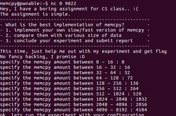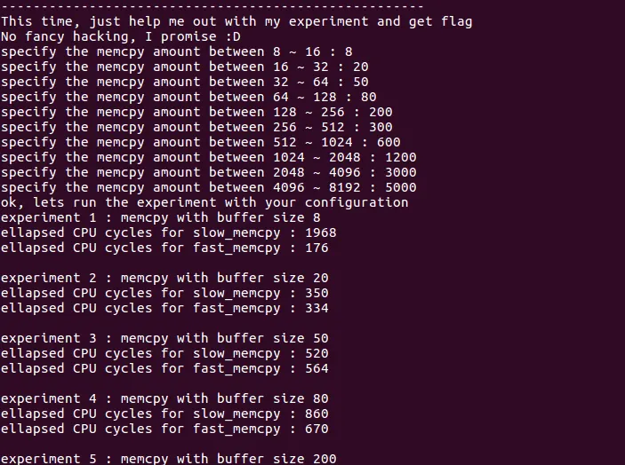 memcpy를 커스텀으로 구현한것 같다. slow/fast 버전이 있는데 이는 소스코드를 확인해야한다. 실험이 성공적으로 끝나면 플래그를 알려준다.