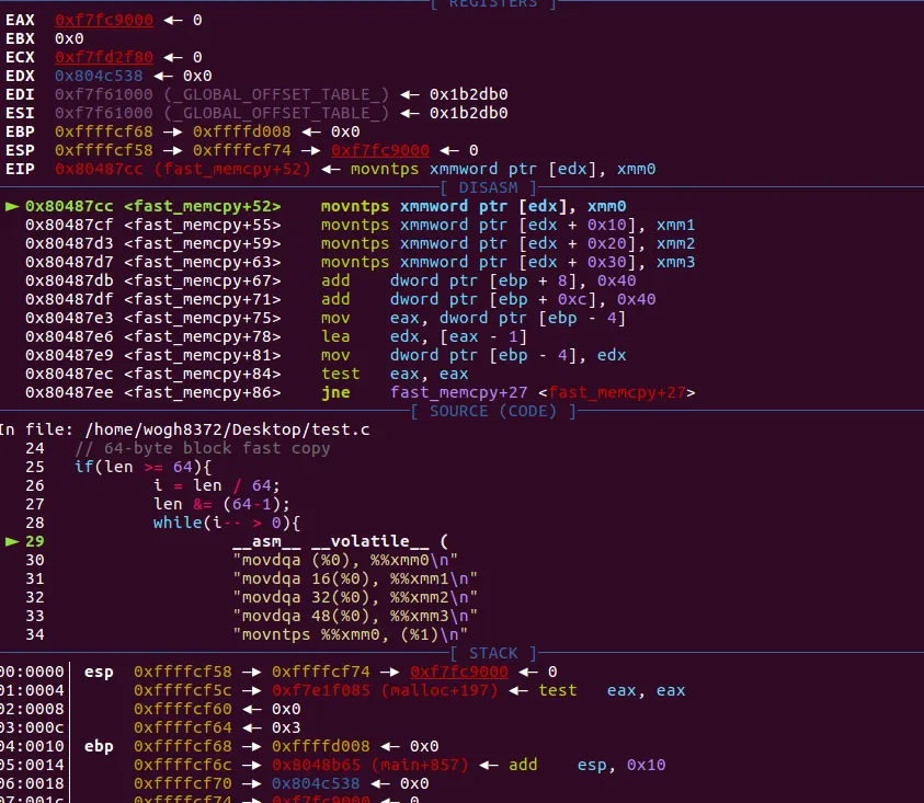 xmm 레지스터는 소수점 연산이나 최적화를 하기 위해서 사용된다. 한번에 16바이트의 데이터를 이동시킬수 있기때문에 성능을 향상시킬수 있다. 여하튼, 이 문제의 키포인트는 edx의 주소가 16바이트로 정렬되어 있지 않기 때문에 발생하는 문제이다.