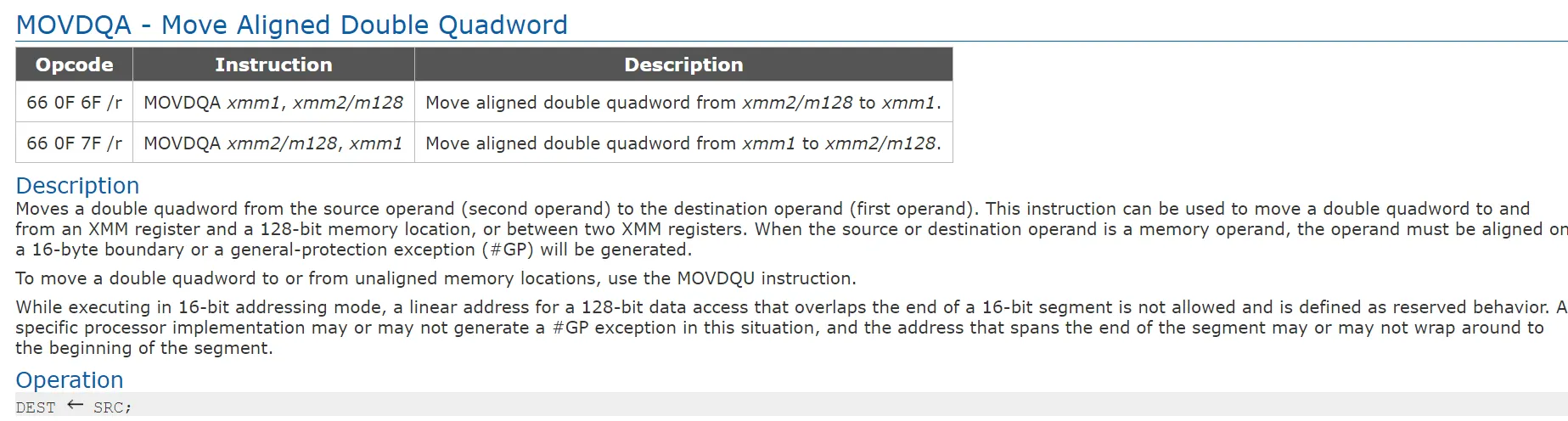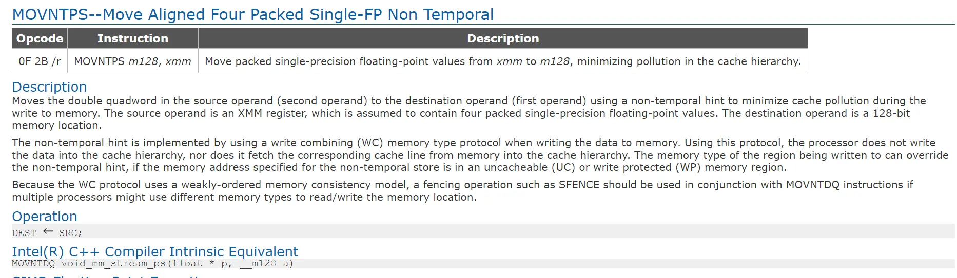 movntps 명령어는 두 번째 오퍼랜드로 입력받은 XMM 레지스터에 있는 float형 데이터 4개를 캐시를 통하지 않고 첫 번째 오퍼랜드로 입력받은 메모리 주소로 복사한다. 여기서 DEST의 주소가 128bit 즉, 16바이트로 정렬되지 않으면 에러가 발생한다.