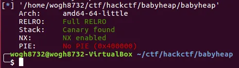 이번 문제는 PIE를 제외하고는 전부다 걸려있다. Full RELRO이기 때문에 Got overwrite가 불가능하다. 문제자체가 babyheap이기 때문에 힙관련 문제인것 같다.
