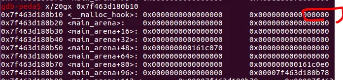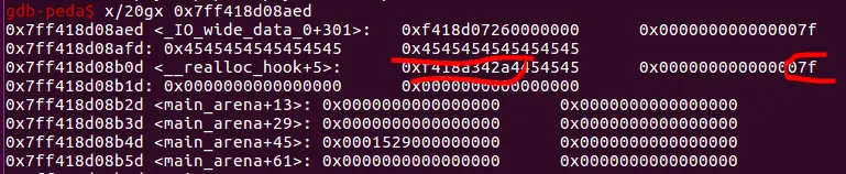 위 상황은 마지막 "malloc_hook-35" 을 재할당받고 해당 위치에 더미값 19개와 원샷 가젯을 입력한 상태이다. 0x45 더미값 19개가 들어갔고, 원샷가젯이 빨간동그라미부분이다.