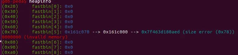 추가적으로 요 0x7f을 사이즈로 둔갑할 것이기 때문에 요청사이즈는 청크헤더 포함 0x70 ~ 0x7f 사이의